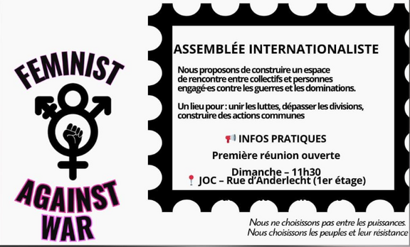 Nous invitons tous les collectifs, associations et personnes engagé·es contre les guerres et les dominations à se rencontrer pour construire un espace d'échange, de réflexion, d'information mutuelle et rédiger collectivement une stratégie pour mettre fin aux massacres et faire entendre nos voix.